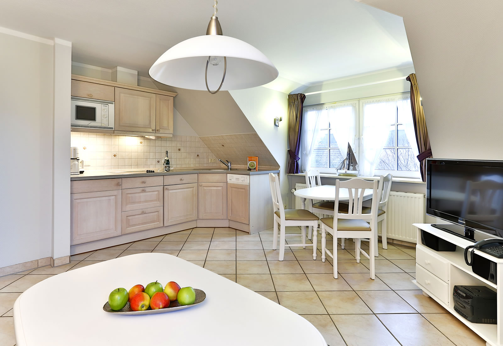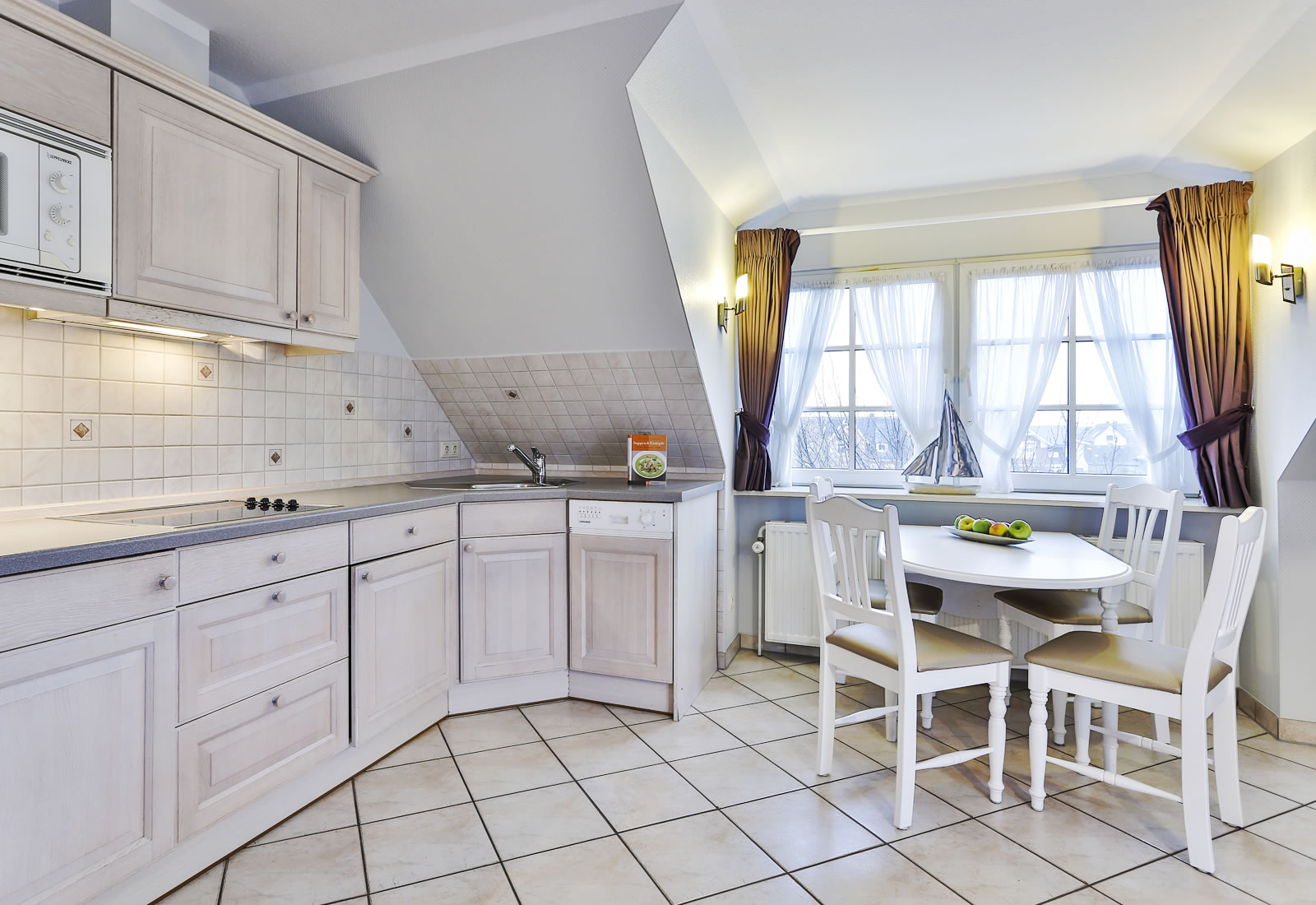 - Küche mit 4er Cerankochfeld, Geschirrspüler, Kühlschrank, Mikrowelle, Kaffeemaschine und Wasserkocher