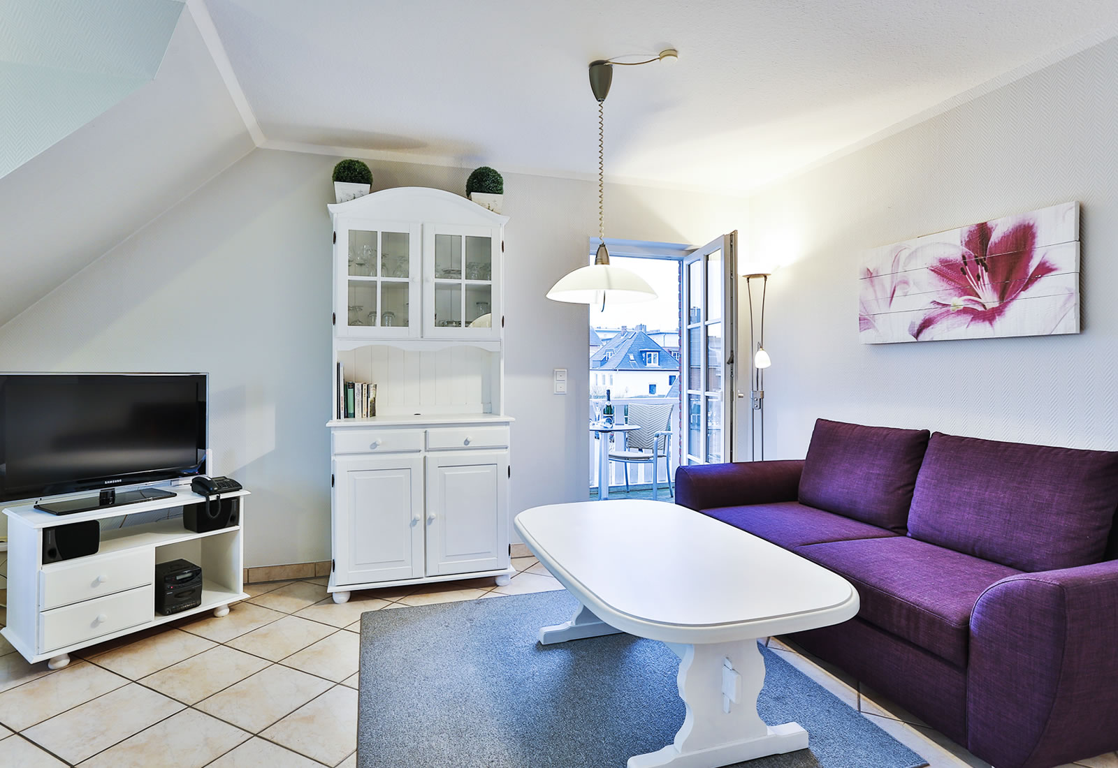Unsere helle, sehr schön geschnittene 2-Zimmer-Ferienwohnung in der 2. Etage bietet Ihnen ein modernes Wohlfühl-Ambiente mitten auf Sylt. Der gemütliche Wohnraum hat direkten Zugang zum möblierten Westbalkon mit herrlichem Stadtblick – perfekt für entspannte Stunden an der frischen Nordseeluft.